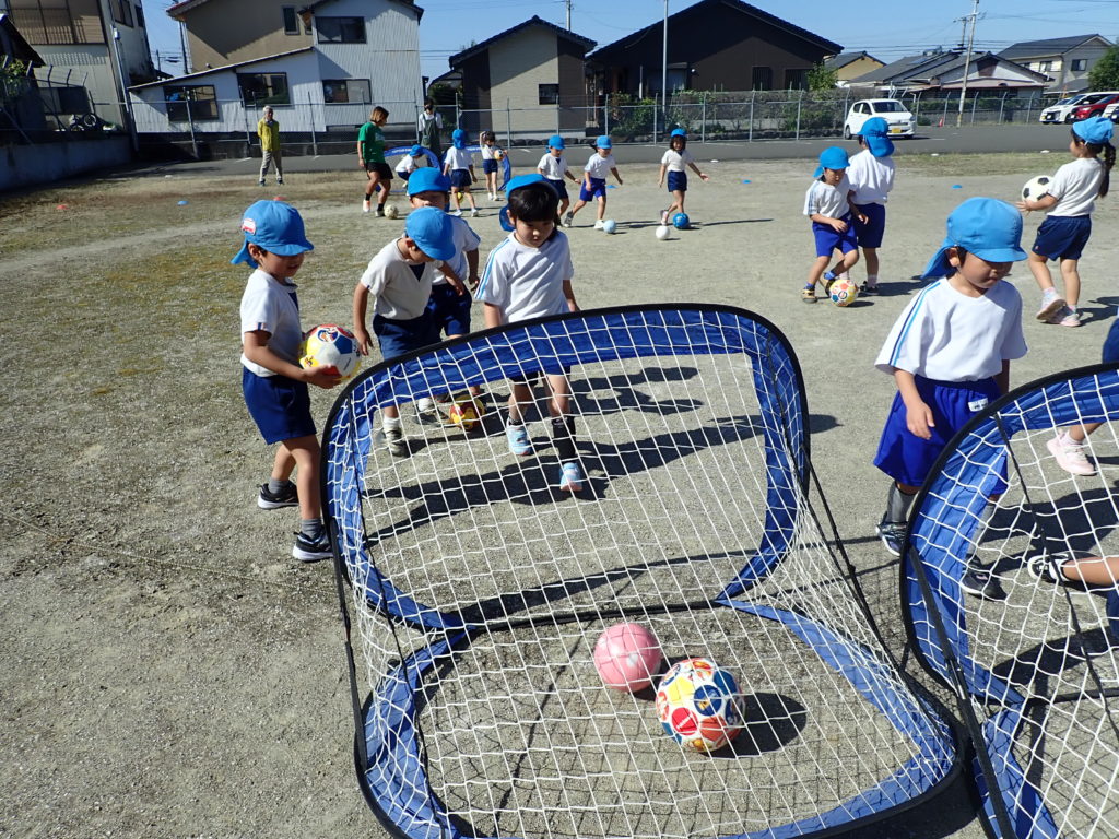 年長児は、サッカー教室にも参加しました。ゴールを目指してボール を蹴る姿は、日本代表の選手のようでした。楽しく走り回り良い経験となりました。