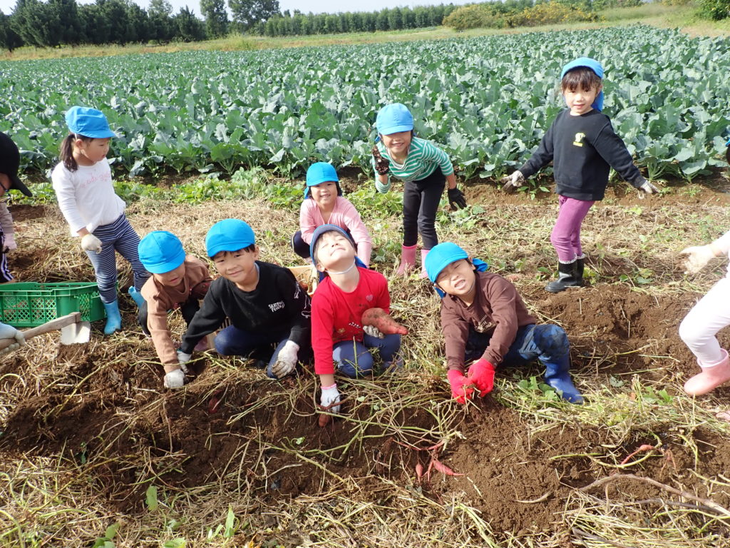 また、3歳児以上で近くの畑に芋ほりにも行きました。大きな芋がたくさん採れ、「先生、見て!大きいお芋採れた(^^♪)」と、夢 中になっていた子どもたちです。
