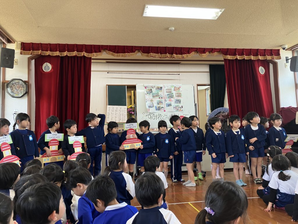 寂しさを感じながらも歌や絵本などの出し物を一緒に楽しみました。最後は年長児さんをトンネルを作って見送りました。